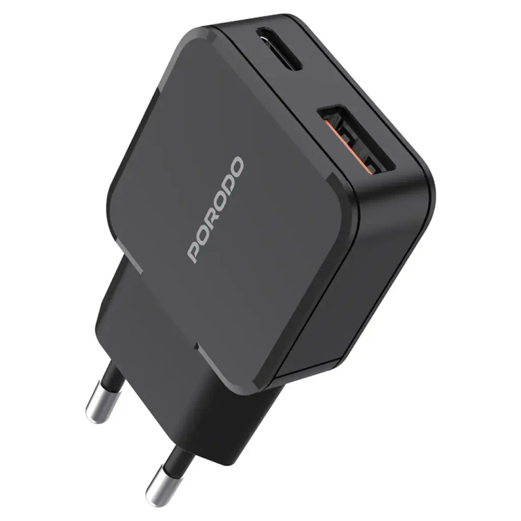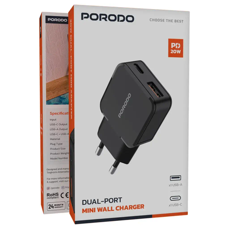 Porodo Dual-Port Mini Wall Charger PD 20W - Black