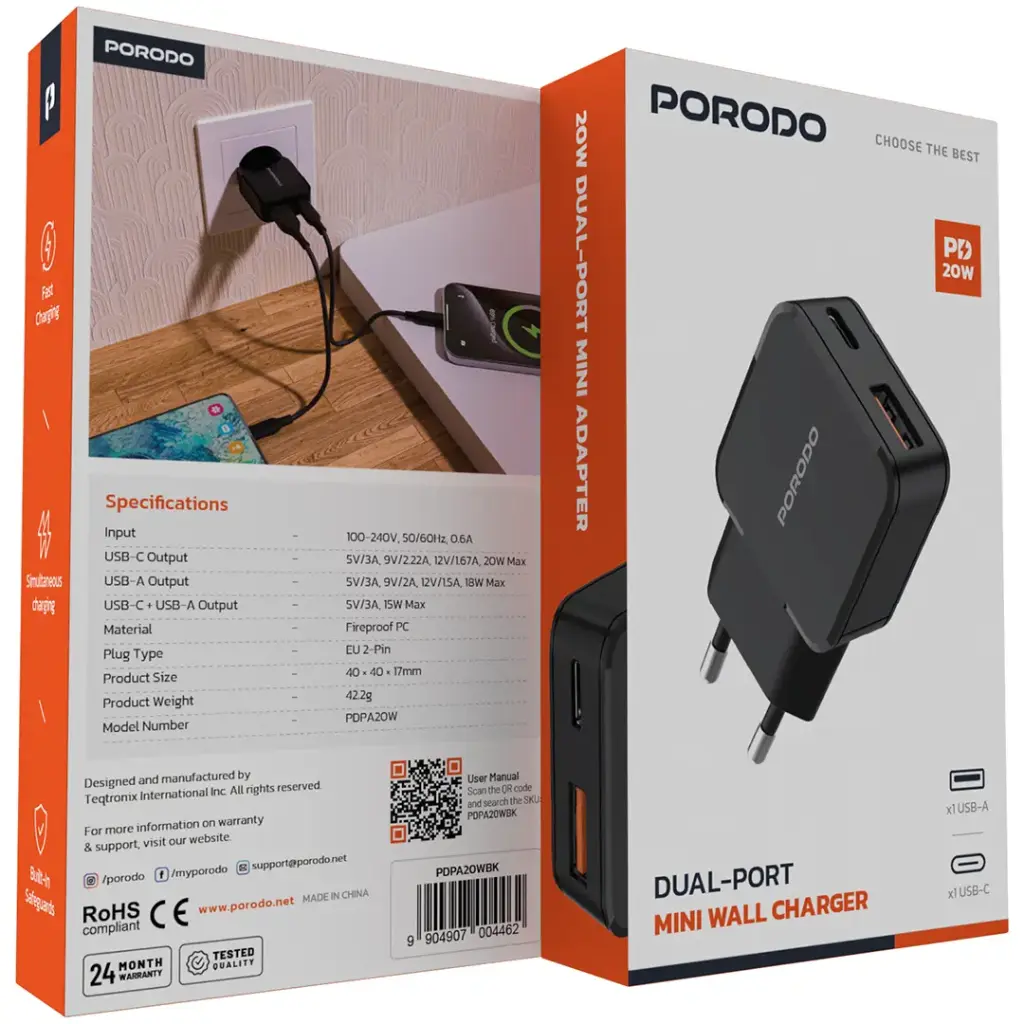 Porodo Dual-Port Mini Wall Charger PD 20W - Black