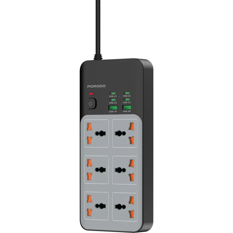 چندراهی برق یونیورسال Porodo 3000W | 6AC با 6 پورت USB (4C + 2A) - خاکستری