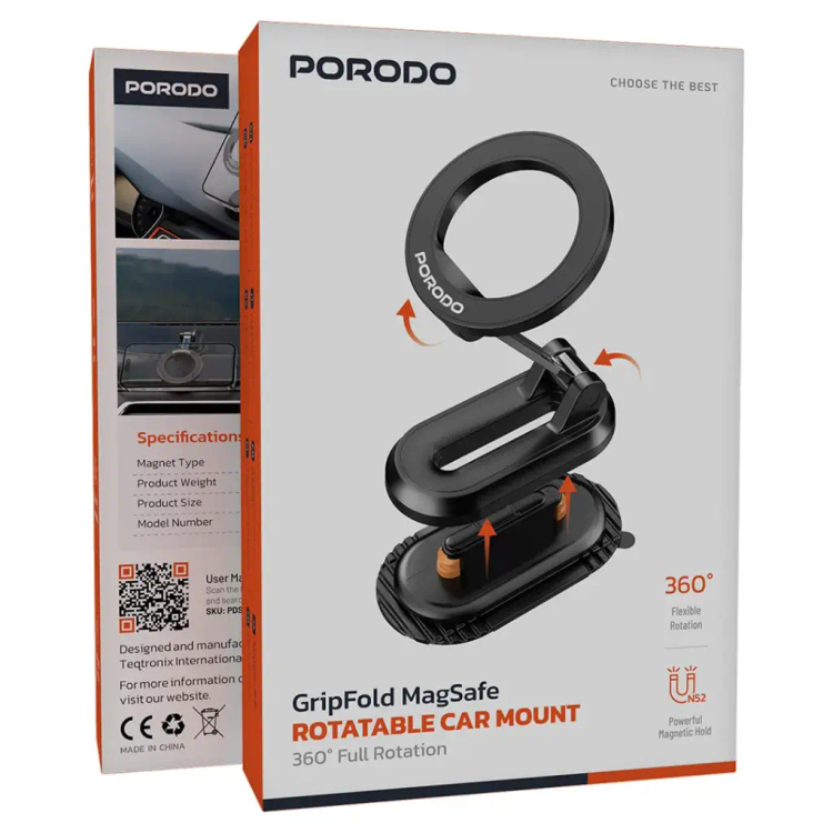 هولدر مگسیف خودرو با چرخش 360 درجه پرودو(PDSKR06)Porodo GripFold MagSafe Rotatable Car Mount 360° Full Rotation – Black