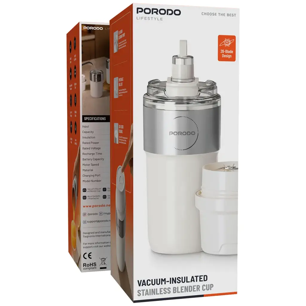 لیوان مخلوطکن استیل ضد زنگ و عایق خلاء مدل White Porodo Lifestyle، پاسخی قدرتمند و کاربردی به نیازهای شما برای مخلوط کردن مواد در سفر است. این لیوان دارای ظرفیت 320 میلیلیتر است و دارای موتور 18500 دور در دقیقه و سیستم 26 پره است که در خرد کردن و مخلوط کردن یخ، بسیار کارآمد است. به لطف طراحی دو درب، میتوان از آن به روشهای مختلفی استفاده کرد و درب نوشیدنی ایمن از هرگونه ریختن مایعات جلوگیری میکند. عایق خلاء، ناجی شما خواهد بود وقتی که نوشیدنیهای خود را حداکثر 6 ساعت گرم یا سرد نگه میدارید، به این معنی که برای استفاده در تمام طول روز مناسب است. لیوان مخلوطکن که با دو باتری 1300 میلیآمپر ساعتی کار میکند، عملکرد شگفتانگیزی را ارائه میدهد و زمان تقریبی شارژ کامل از طریق پورت Type-C تنها 4 ساعت است. این لیوان از جنس استیل ضد زنگ SUS304 محکم ساخته شده است و بنابراین میتواند مدت زیادی دوام بیاورد، در حالی که طراحی حمل آسان آن به قابلیت حمل آن میافزاید. اگر به اسموتی، شیک یا نوشیدنی پروتئینی نیاز دارید، این مخلوطکن به سرعت به شما نتیجه میدهد و بنابراین برای سبک زندگی پرمشغله ایدهآل است