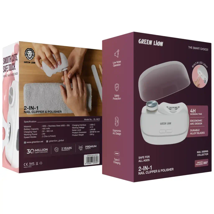ناخنگیر و پولیش دوکاره گرین لاین به رنگ سفید، ابزاری چندکاره و کاربردی است که مراقبت از ناخن را بسیار آسان میکند. این دستگاه از ABS و استیل ضد زنگ ساخته شده است که هر دو بسیار قوی و بادوام هستند، به علاوه دارای طراحی قوسی ارگونومیک است که باعث میشود به راحتی در دست قرار گیرد. باتری قابل شارژ ۴۵۰ میلیآمپر ساعتی آن، حداکثر ۴ ساعت استفاده مداوم را با یک بار شارژ از طریق رابط USB-C امکانپذیر میکند. این دستگاه هنگام کار بسیار بیصدا است زیرا صدایی معادل یا کمتر از ۴۸ دسیبل تولید میکند که آن را برای استفاده افراد در هر سنی مناسب میکند. این دستگاه دارای دو تنظیم سرعت (برش و پولیش) است که امکان کوتاه کردن دقیق ناخن و نرم کردن آن را فراهم میکند. چراغ LED داخلی، روشنایی بهتری را فراهم میکند در حالی که جمعآوریکننده بقایای ناخن، تمیزی ناحیه را حفظ میکند. عملکرد پولیش با چرخش ۳۶۰ درجه، نتایج یکنواخت و نرمی را ارائه میدهد و به سرعت به بخش ضروری از برنامه نظافت شما تبدیل میشود. این دستگاه دارای ویژگیهای محافظت ایمنی و همچنین ولتاژ کاری ۳.۷ ولت است که آن را نه تنها به بهترین ناخنگیر و پولیشکار تبدیل میکند، بلکه ابزاری کارآمد، ایمن و کاربرپسند برای کل کارگاه مراقبت از ناخن شما نیز هست.